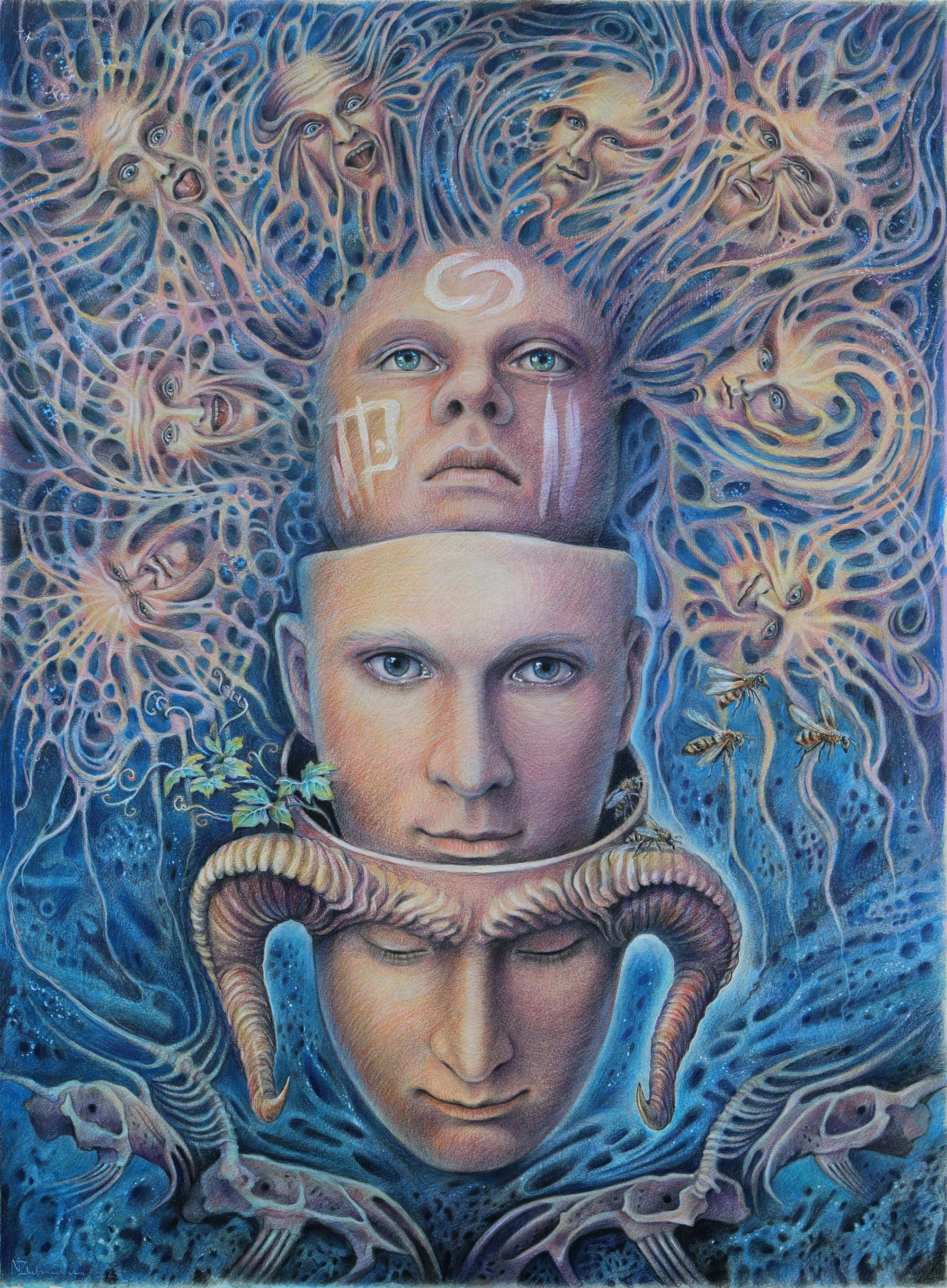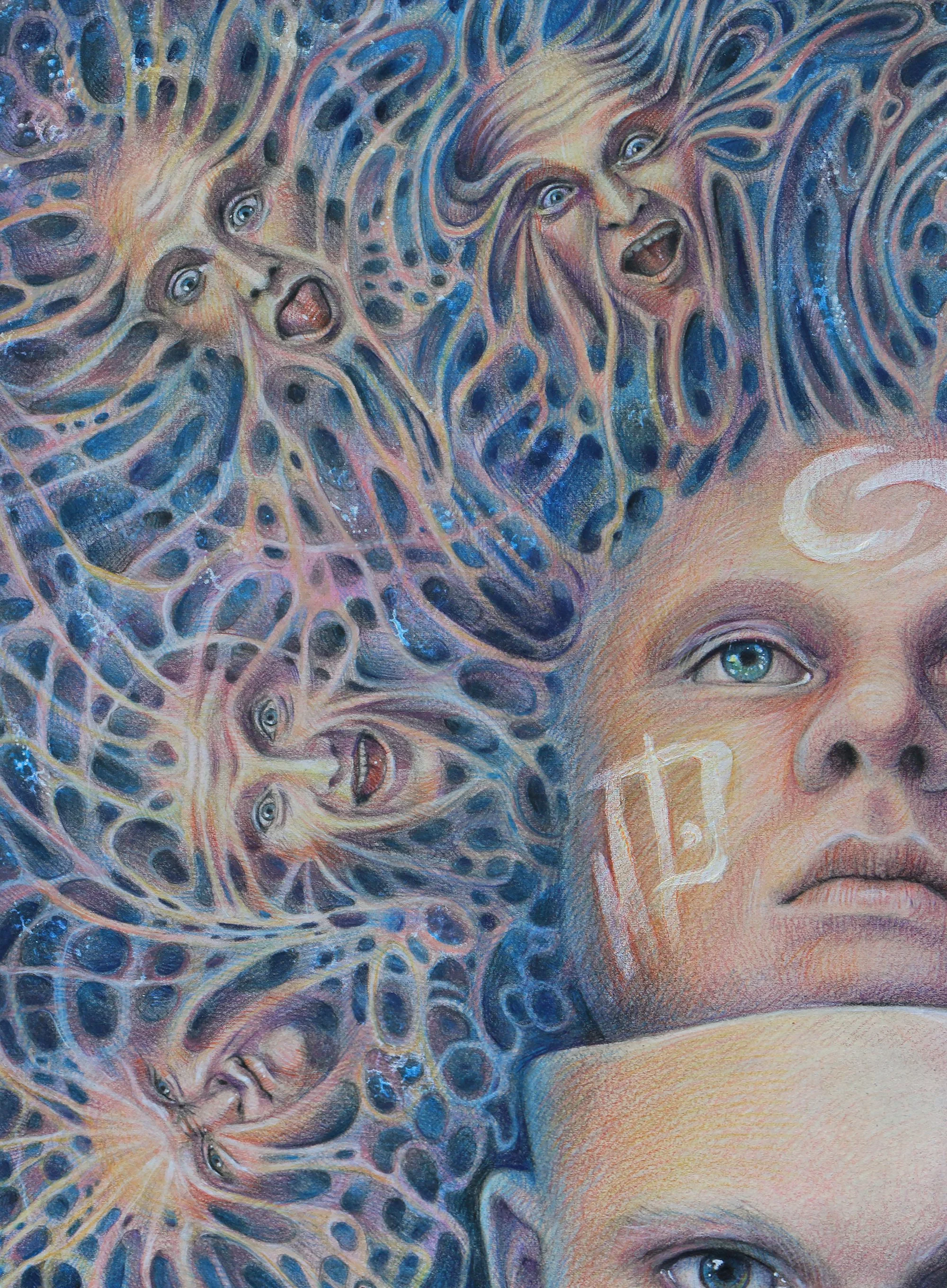 At the center of the composition are three faces emerging from one another, each symbolizing a different level of perception:
