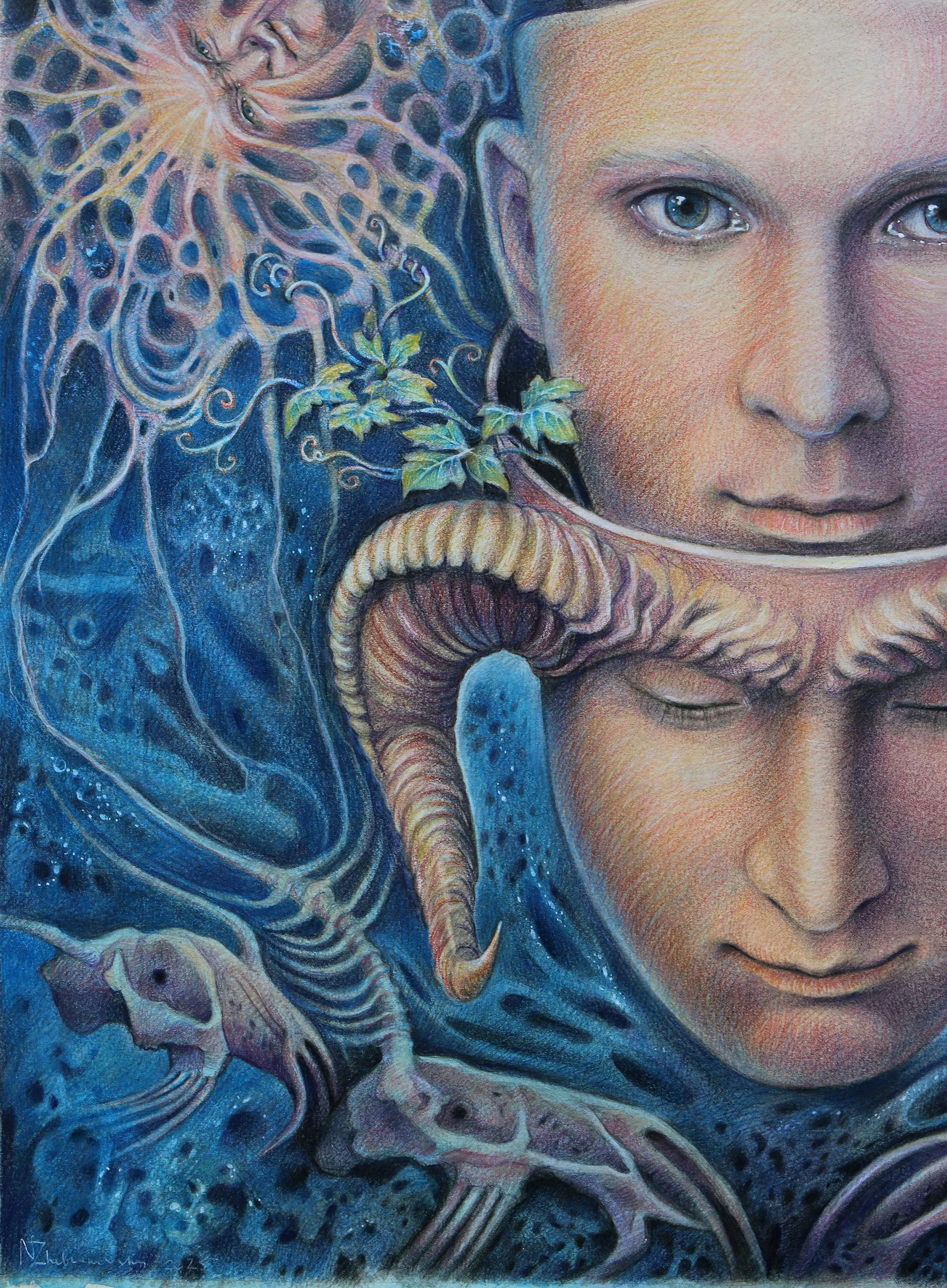 • The lower head with horns represents the material and instinctual aspect — the realm of sensations, bodily impulses, and primal reactions.