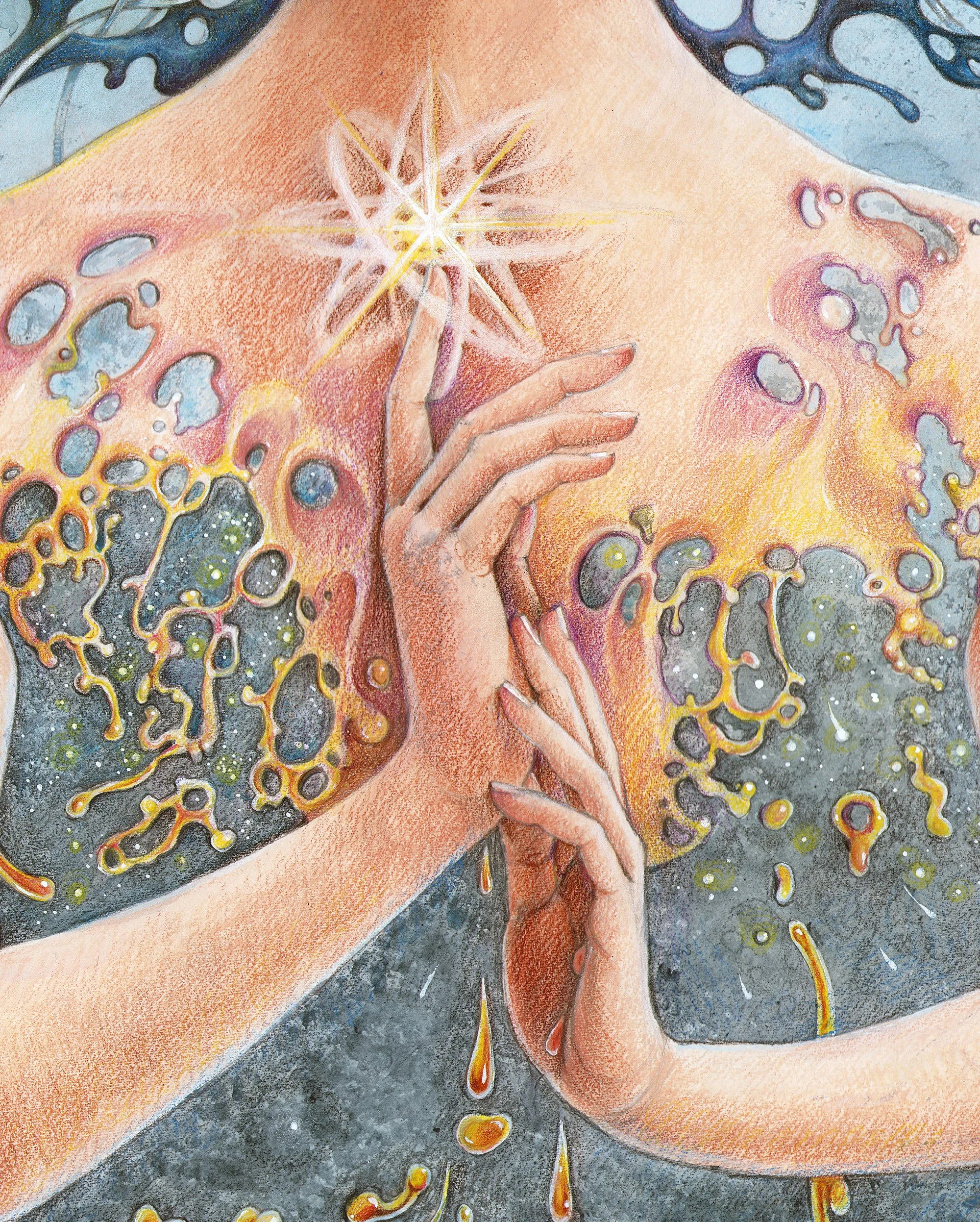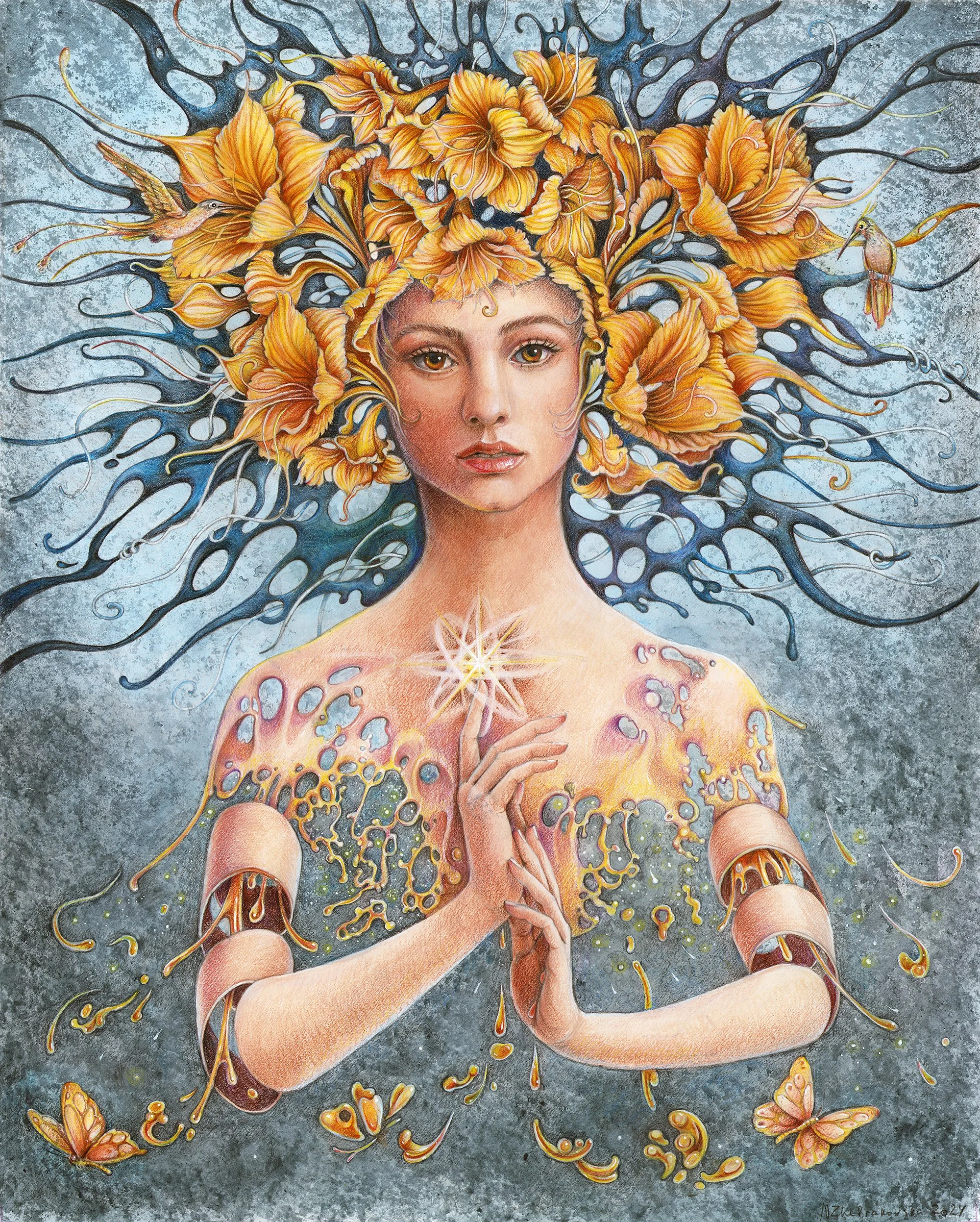 Meditation explores the transformative journey of deep meditation, where the boundaries between the material world and the inner self dissolve. The woman’s body gradually dissolves into droplets, symbolizing the release of the physical form and the transcendence to a higher state of consciousness. These droplets transform into butterflies, representing the emergence of beauty and harmony from darkness. Golden-yellow flowers grow from her head, symbolizing the blossoming of wisdom and positive, harmonious thoughts. The glowing atom-like sphere on her finger emphasizes the interconnectedness of all things and the power to transform and harmonize the mind and spirit. Behind her head, a dark, web-like form represents the chaos of the mind before it undergoes purification. The birds, one perched on the dark shape and the other feeding from a flower, reflect the balance between inner turmoil and peace. This artwork invites the viewer to contemplate the journey of self-discovery and the shedding of negativity in pursuit of enlightenment. It captures the essence of deep meditation as a process of inner awakening and transformation.